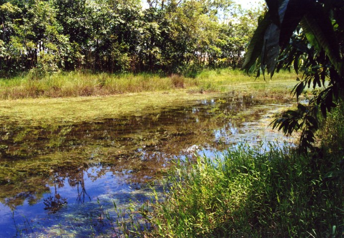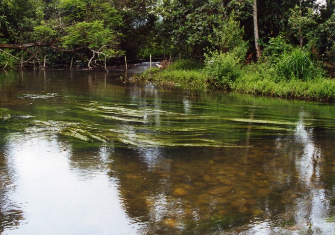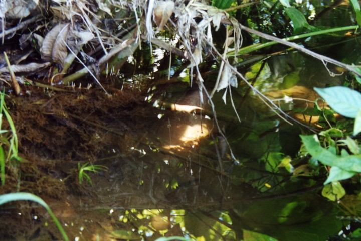 Maar ook boven water was er veel te zien. Zomaar midden op de weg een hagedis (40 cm) of `s avonds op het gras bij onze lodge twee enorme kikkers. Dat was wel even schrikken.Vlak bij ons verblijf lag een grote kazerne. Hierachter liep een weg de bossen in, hier kwamen we een beekje tegen, het was een aquarium onder water. Het water was snelstromend en glashelder en stond vol met planten zoals; Ludwigia`s Eichhornia natans Cabomba Bacopa Amplexcicalus Alternanthera. Deze laatste stonden in bloei onder water met kleine paarsachtige bloempjes.Onder water was het een lust voor het oog alsof je in een groot aquarium zwom overal planten en vissen. Veel Ruitvlekzalmen (planteneter???) groenvoer genoeg.Maar hier troffen we een Crenicichla`s aan die zich prachtig op de video lieten zetten. Nadat we hier een paar uur hadden rondgekeken zowel onder als boven water werd het tijd voor de volgende vangplaats.