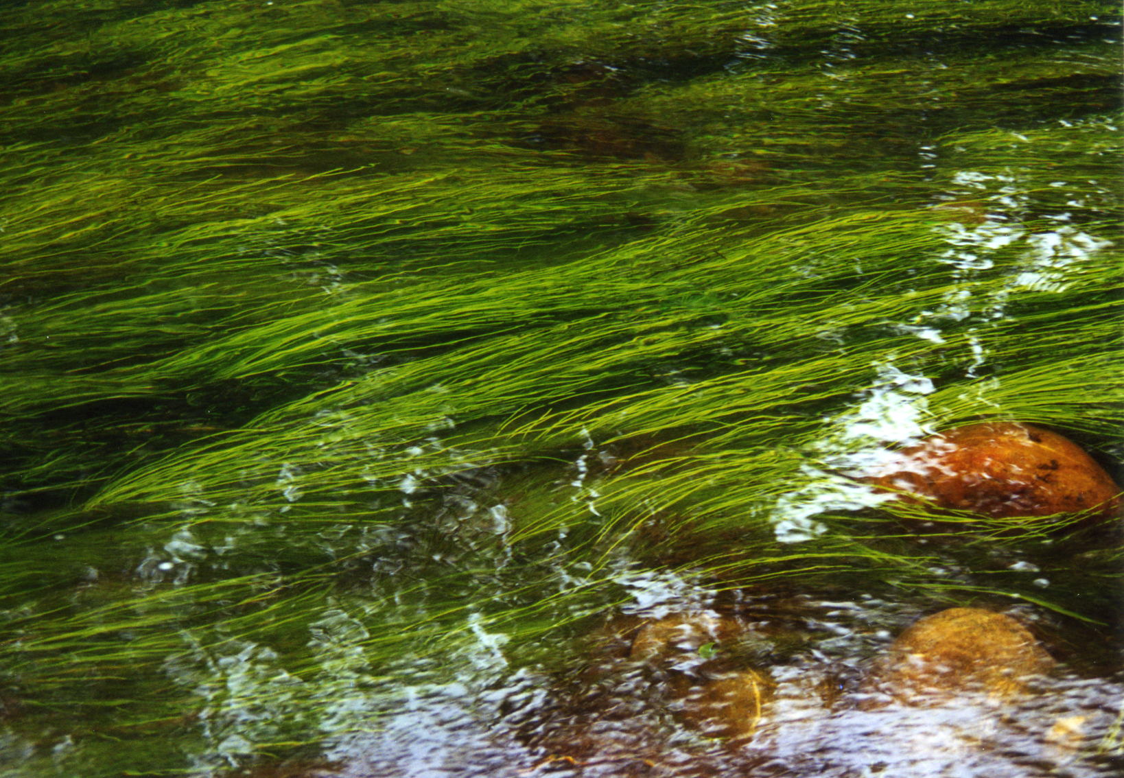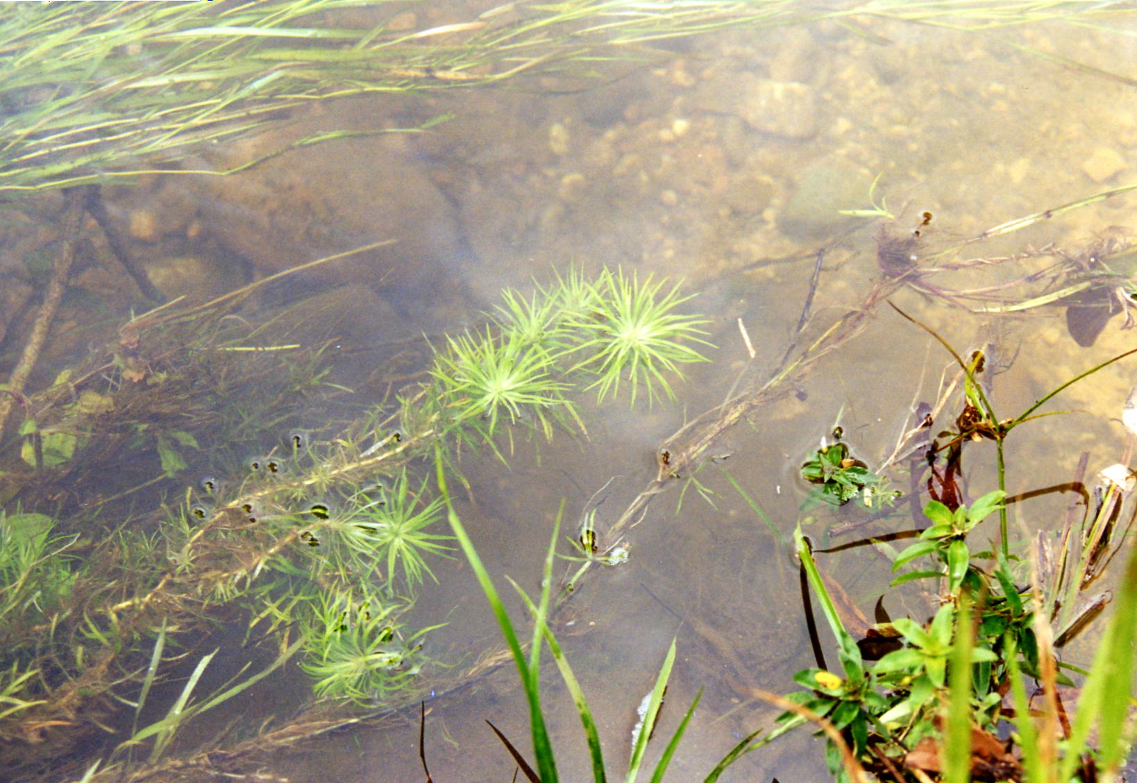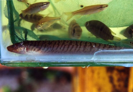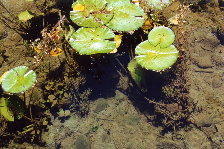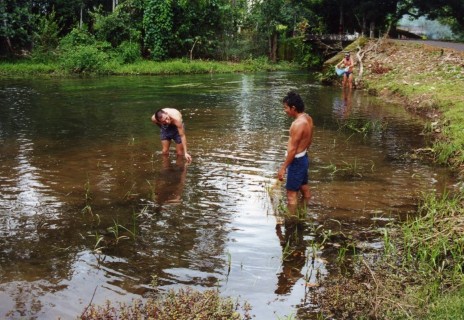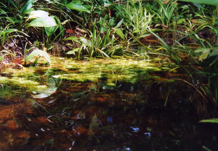 Nadat alles was verpakt gingen op weg naar de volgende Rio. Dit was een klein beekje van c.a.2 meterbreed. Prachtig helder water en een bodem van stenen. Deze waren totaal bealgd en stoffig. Maar het barste er van de vissen en planten. Het eerste watertje was met planten. In het water stonden lotussen, amazone zwaardplanten en veel mossoorten op de stenen die onder en boven water lagen. Vissen waren er zoals; Zalmen Mesvissen Spatzalmen Hemigrammus Garnalen Corydoras melanotaenia Ancistrus spec Farlowella’s en Loricaria’s .De volgende dag hadden we een plaatselijke visser gehuurd om ons naar plekken te brengen waar veel aquariumvissen werden gevangen. Van de vorige reis wisten we dat er in deze omgeving zeer mooie riviertjes waren met weelderige plantengroei en speciale vissen. Dus wij op zoek.Onze eerste rivier was eigenlijk een grote plas waar een rivier door stroomde. Langs de oever stonden velden met in bloei staande Ludwigia’s. Het waren prachtige gele bloemetjes. Het eerste gedeelte van de plas was erg ondiep ca15 cm, hierin zagen we tientallen jonge visjes (Aequidens en Apistogramma’s) op zoek naar voedsel. Maar onder water was het nog mooier, lang hebben we hier niet van kunnen genieten want we kwamen een koraalslang tegen en dan moet je wegwezen.