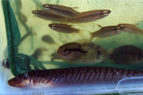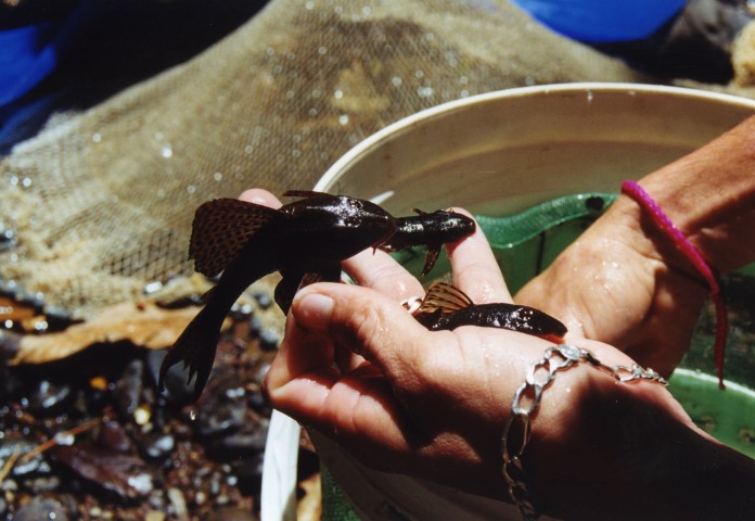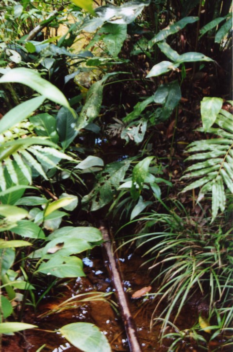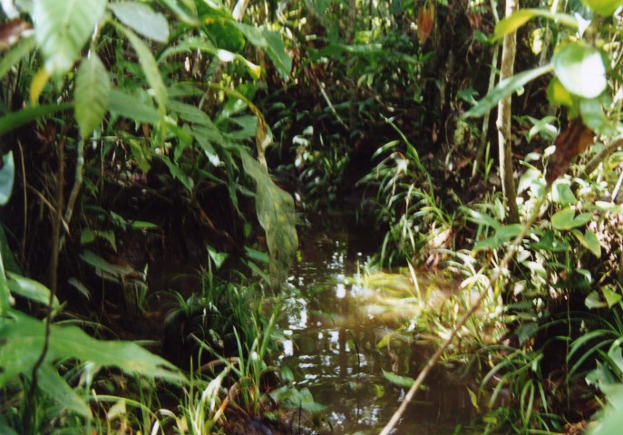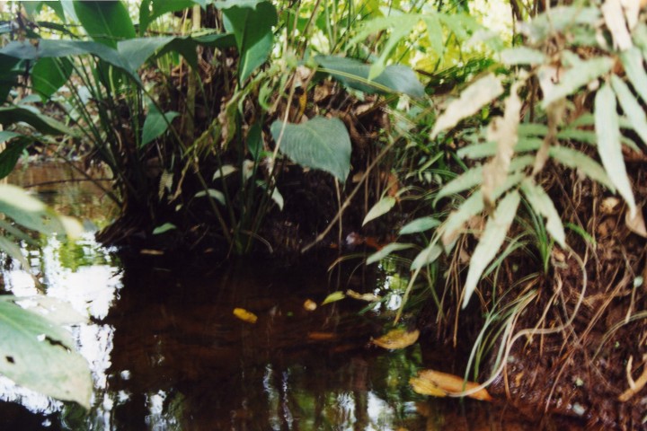 Van hier af lopen tientallen kleine en grote beekjes de bergen af ons doel voor de komende week.Onze eerste nacht hebben we geen oog dichtgedaan vanwege zwaar onweer. Hoezo geen regen? We waren dan ook vroeg op, en zijn naar de beek gegaan om te kijken wat er te vangen viel.Het is een prachtig snel stromend water met een diepte van ca.30 cm, de bodem bestond uit rolstenen en kiezelstenen. Vele soorten vissen zagen we zwemmen. Corydoras metae Loricaria’s Ancistrus Spatzalmen en Ruitvlekzalmen.Na een uurtje stond het ontbijt op tafel en moesten we weer terug. Op het programma stond de weg naar Puerto-Lopez, hier moesten vele kleine beekjes onder de weg doorstromen. We vonden wel de bruggen maar geen water.Na veel zoeken hebben we een prachtige beek gevonden (met water) maar was helaas zeer troebel.Toch even met de snorkel onder water gekeken. Zeer veel vissen gezien vooral zalmsoorten.