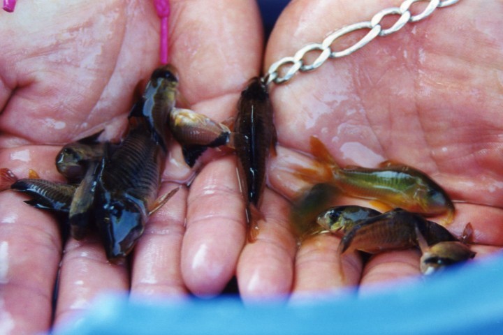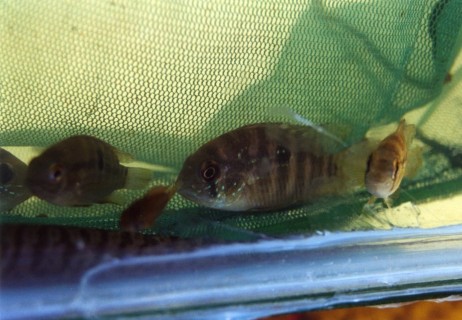 Na nog wat te hebben rondgekeken zijn we op weg gegaan naar de volgende rivier. Deze zag er vanaf de brug een stuk beter uit. Slingerend door het landschap met een rijke begroeiing van bomen en struiken. In het water boomstronken en takken, ideaal voor kleine cichliden zoals Apistogramma, Aequidens en Harnasmeervallen. In de snelstromende gedeelten werd helaas weinig gevangen, maar in de dode stukken met weinig stroming vingen we onze eerste Apistogramma Macmasteri. Ook hier weer Corydoras metae en enkele jonge Aequidens Meta.