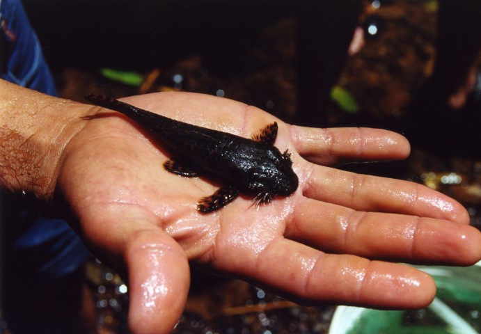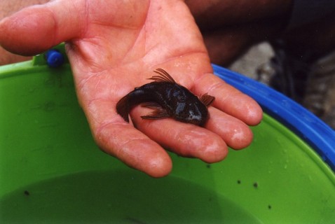 Alleen we hadden een probleem, hoe kwamen we beneden, er was geen weg te zien. Er zat niet anders op om dit te vragen. Er was een weg maar deze was privé. We hebben uitgelegd wat de bedoeling was en mochten er gebruik van maken.Alleen als ik toen geweten had wat ons te wachten stond was ik boven gebleven. De weg was niets anders dan een pad met rolstenen en liep steil naar beneden.Als de auto moest remmen om een bocht te nemen rolde je op de stenen nog een paar meter verder. Dit werd ons te gevaarlijk en zijn uitgestapt. Dan maar lopend naar beneden.Helaas stroomde de rivier veel te hard om te vissen. Toch nog iets bijzonders. De hoofdstroom werd gevoed met een zijstroom, maar deze stroomde de verkeerde kant op. Een heel apart gezicht om een rivier twee verschillende richtingen op te zien stromen. Uit het dal nog drie personen extra meegenomen zodat onze Nissan bus er zwaar aan moest trekken.De volgende dag moesten we eerst met de auto naar de garage want in de aandrijfas zat een rammelend geluid. Deze reparatie duurde de gehele dag. Zelf ben ik mee geweest om er op toe te zien dat dit wel goed gebeurde. Als in Holland de garagebedrijven zo zouden werken als in Colombia dan hadden we grote problemen. Maar met veel begeleiding was het euvel in een dag verholpen.We hadden nog een dag en deze werd besteed aan de Rio Artenal. Langs deze rivier was een rijke begroeiing van allerlei planten, bomen en vooral bamboe. Ook in het water lagen de stengels van deze plant.Tijdens het vangen van vooral harnasmeervallen kwamen we tot de ontdekking dat de holle stengel ideale schuilplaatsen waren voor deze vissen. Dus stengels openbreken en vissen “rapen”.Maar in een van die stengels troffen we een man van de Chaetostoma Thomasi aan met een prachtig nest jongen. Ik schat circa 150 jongen. De jongen hadden de dooierzak nog. Het hele legsel met het mannetje in de fotocurve gedaan. Binnen een minuut hadden alle jongen zich weer om en op het mannetje verzameld, en pa ging verder met de broedzorg. Na alles op de foto en video gezet te hebben, hebben we alles weer terug gezet.De waterwaarden waren temp.25C, micr. 180 en pH 8,1. Hier hebben we voor het eerst grote aantallen Sturisoma’s gevangen. (ca. 100 stuks). Tevens grote aantallen Chaetostomus en weer de grote aantallen levendbarenden. Vooral de Poecilia Sphenops. Een prachtig mooie vis met een oranje band aan de staartvin, deze vissen komen hier veel voor.Aan planten kwamen we hier veel waterhyacinten tegen, ook een plant die leek op hoornblad. In dit gebied kom je vanwege de stenen veel harnasmeervallen tegen.