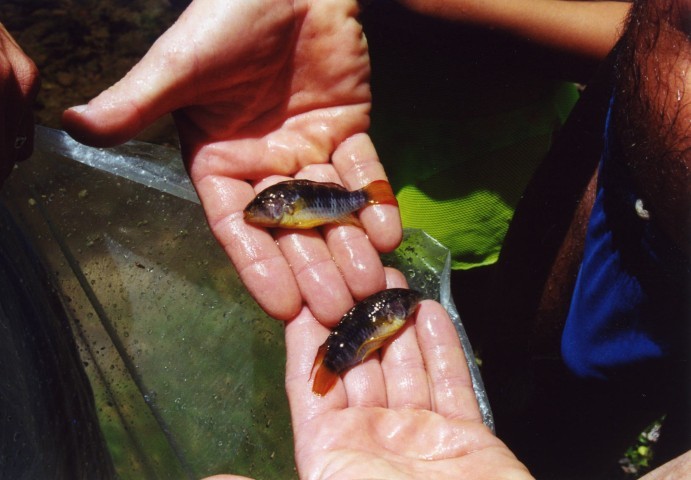 Na in het dorp een heerlijk koel drankje te hebben gedronken namen we afscheid van de bewoners en gingen op weg naar de Rio Leoncilla. Ook deze stond voor een groot gedeelte droog. In een gedeelte van deze Rio stond nog wat rest water.En onze ervaring had geleerd om toch maar even te gaan kijken. Lopend over de stenen op de bodem van de rivier viel het op dat langs deze oever vele prachtige planten stonden zoals; papyrussen en varens. In de bocht stond nog een flinke plas water dus maar even onder water kijken.Het was net een aquarium met honderden vissen die tussen de stenen en takken zwommen. Het water was kraak helder dus konden we prachtige opnames maken. Voor de lens kregen we een mooie Aequidens Sapayensis diezich met hun prachtige kleuren uitgebreid op de video liet zetten. Ook hier weer veel levendbarende vissen en diverse zalmsoorten.