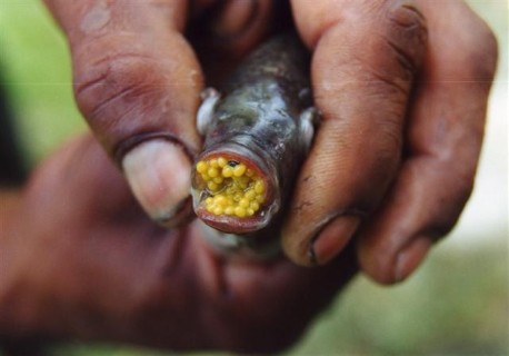 Zorg dat je met de auto goed in zicht staat en dan maar een paar keer op de claxon drukken en de bezitter van de finca komt dan wel te voorschijn. Altijd mochten we met de auto over het terrein naar het water.De mensen zijn heel vriendelijk maar ook zeer verbaasd. Dat wij zo een lange reis maken voor wat kleine visjes die niet eens te eten zijn.Op de kaart hadden we een groot meer gezien met talrijke kleine Rio’s dit was ons reisdoel voor de volgende dag. Na een autorit van een klein uur kwamen we aan bij het meer van Darien vlak bij Buga.Maar eerst moesten we in het dorp een familiebezoek afleggen. We werden hartelijk ontvangen door allerlei mensen die druk met elkaar stonden te praten en wij verstonden er niets van. Een gids mee en op weg naar het meer.Bovenaan de bergrug hadden we prachtig uitzicht over het meer maar beneden viel het behoorlijk tegen. Door de wind die dwars over het meer waaide, was het water erg troebel geworden. We konden nog wel grote scholen vissen zien aan de oppervlakte maar verder was het slecht. Wel nog even een meting verricht, pH 8,2, - micros. 80 en temp.27 C. In het meer zagen we voor het eerst in deze omgeving enige planten groei. Het was een soort riet en iets dat veel leek op waterpest.Langs de oever in het ondiepe gedeelte zagen we tevens honderden jonge cichliden zwemmen, vangen was helaas onmogelijk vanwege de plantengroei.