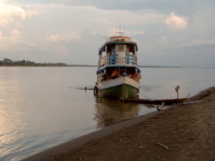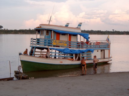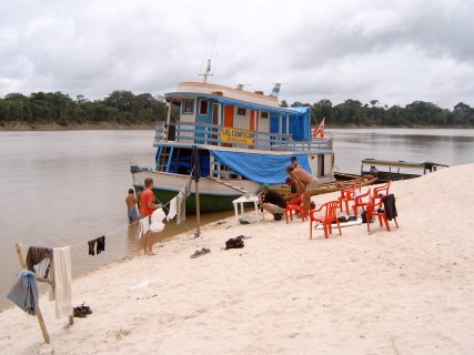Ons doel was de Yavari rivier met als einddoel Sacambu. De eerste dag kwamen we tot Benjamin Constant dit ging met veel problemen. Door de sterke stroming liep de boot op een zandbank vast. Met veel moeite konden we weer loskomen, maar toen de motoren van de kano s ook problemen kregen was het over en uit. De volgende dag hebben we een andere kano gevraagd en zijn met deze richting Sacambu gevaren. Dit is een prachtig gebied met veel kleine riviertjes met theekleurig water en een rijk visbestand. Onderweg hadden we een schitterend wit strand gezien en dit leek ons de plaats om de boot de komende week voor anker te laten gaan. De volgende dag werd de boot naar het strand gesleept. De middag hebben we besteed met het leggen van contacten met de plaatselijke vissers. Voor de komende week hadden we deze hard nodig.