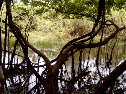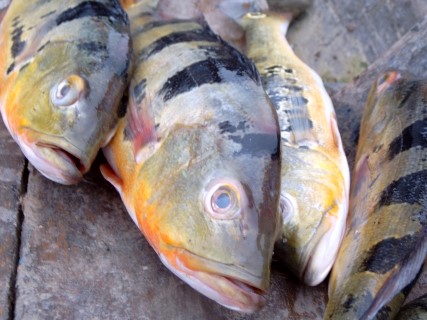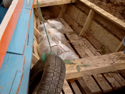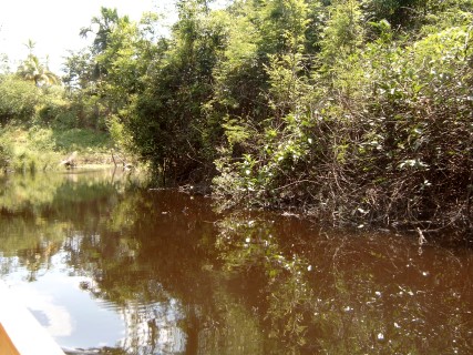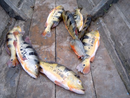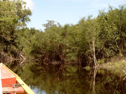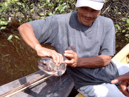 Maar helaas de motor bleef weigeren. Maar om elf uur kwam er geluid uit en we konden varen richting Rondonia waar prachtige lagunes waren die de moeite waard waren om te bezoeken. Na 3 uur varen kwamen we op de uitgezochte plek aan. Alleen onze gids begreep er niets van wat we in het oerwoud wilde gaan doen. Op deze plaats kreeg hij dan ook les in het vangen van aquariumvissen. De komende dagen zouden in het teken staan van de motor, die was stuk en de mensen deden hun best om hem te repareren maar het was onbegonnen werk. Nadat we weer in Leticia waren teruggekeerd was het over en uit. Toen hebben we besloten om met 2 motorkano’s zelf maar het oerwoud in te gaan. In de omgeving waren nog genoeg prachtige watertjes om te vissen, te snorkelen, of andere leuke dingen te doen. Maar na 2 dagen waren we het zat. De oplossing was 2 kano`s naast de boot leggen en zo te gaan varen.